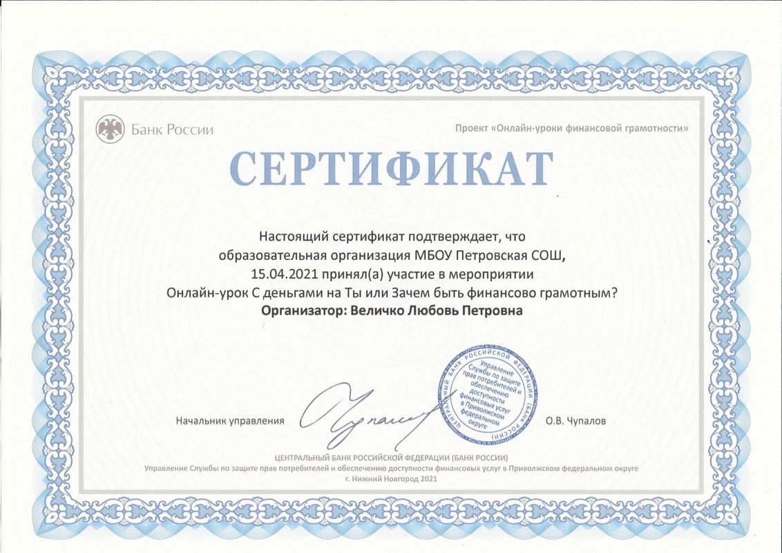 Обучающиеся МБОУ Петровской СОШ приняли участие в следующих онлайн-уроках финансовой грамотности весенней сессии: